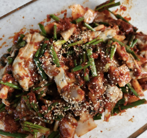 - 썰어놓은 채소와 굴을 한 곳에 담고 고춧가루 2, 멸치액젓 1, 식초 1, 다진 마늘 0.5, 설탕 0.5, 참기름 0.5, 생강가루 약간 넣고 살살 버무리면 완성됩니다.